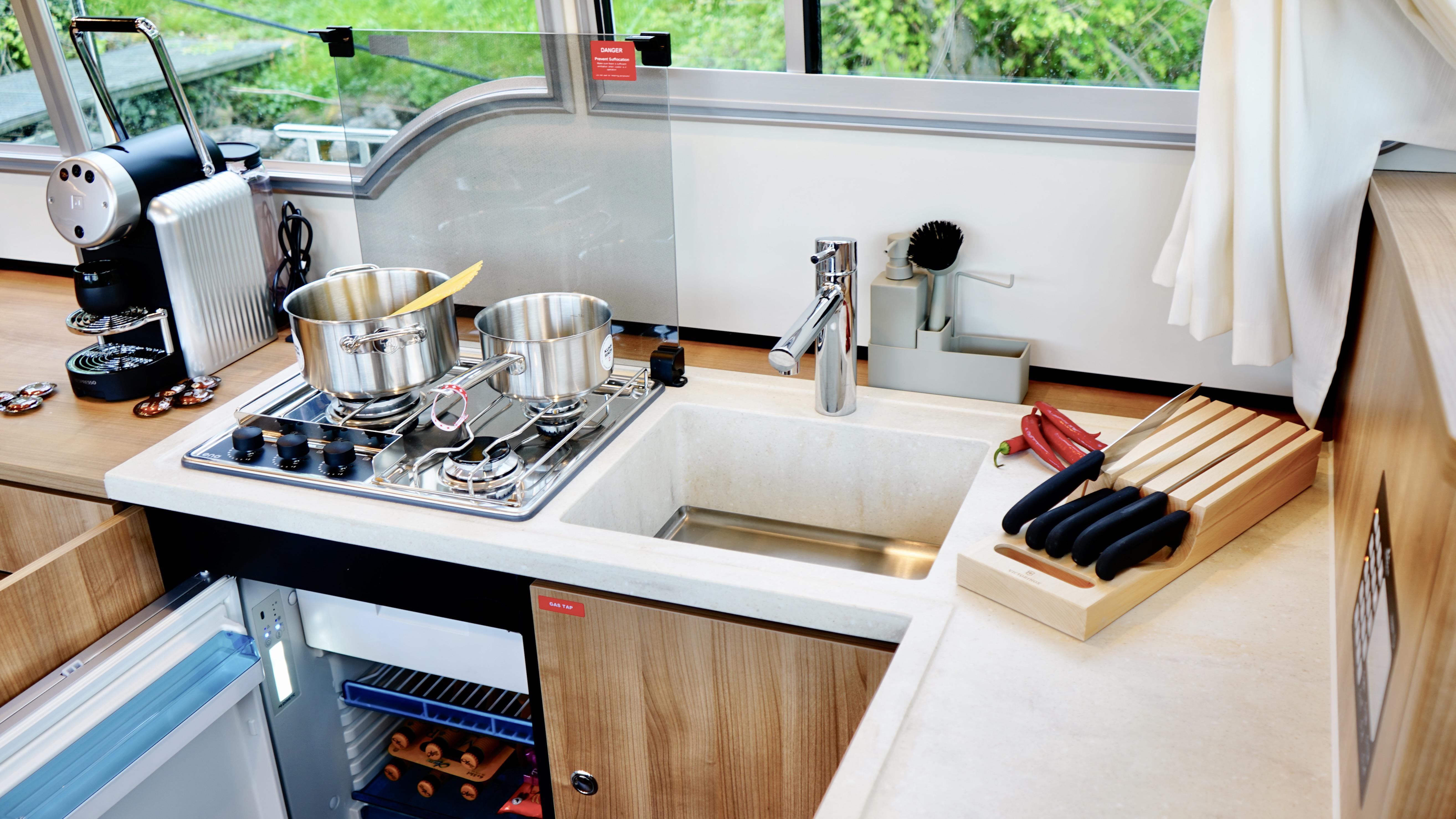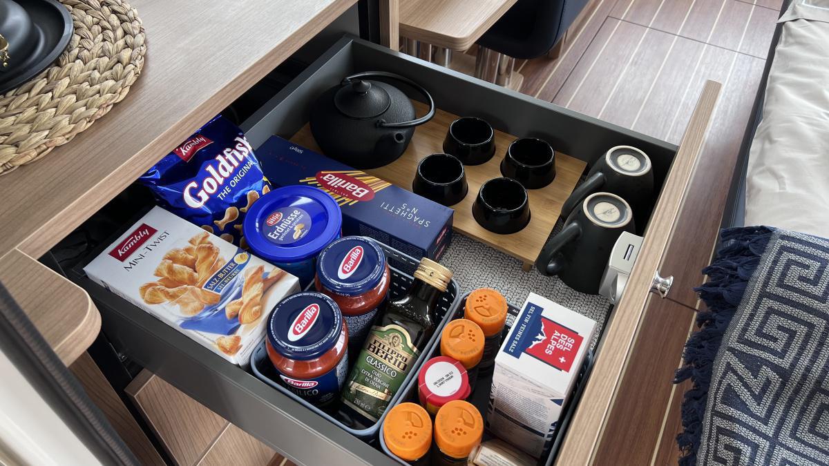 Es ist alles an Bord: Das Einzige, was du mitzubringen hast, sind deine Kleidung und gute Laune! Das Gas für die Küche ist inkl. Reserve- Behälter an Bord. Toilettenpapier ist aufgefüllt und die Duschseife aus Schweizer Produktion ist auch mit an Bord. Für den Morgenkaffe sorgt eine Nespressomaschine und vom Messer über Gabel bis zum Dosenöffner ist alles da, um den Tisch zu decken und was leckeres zu kochen.